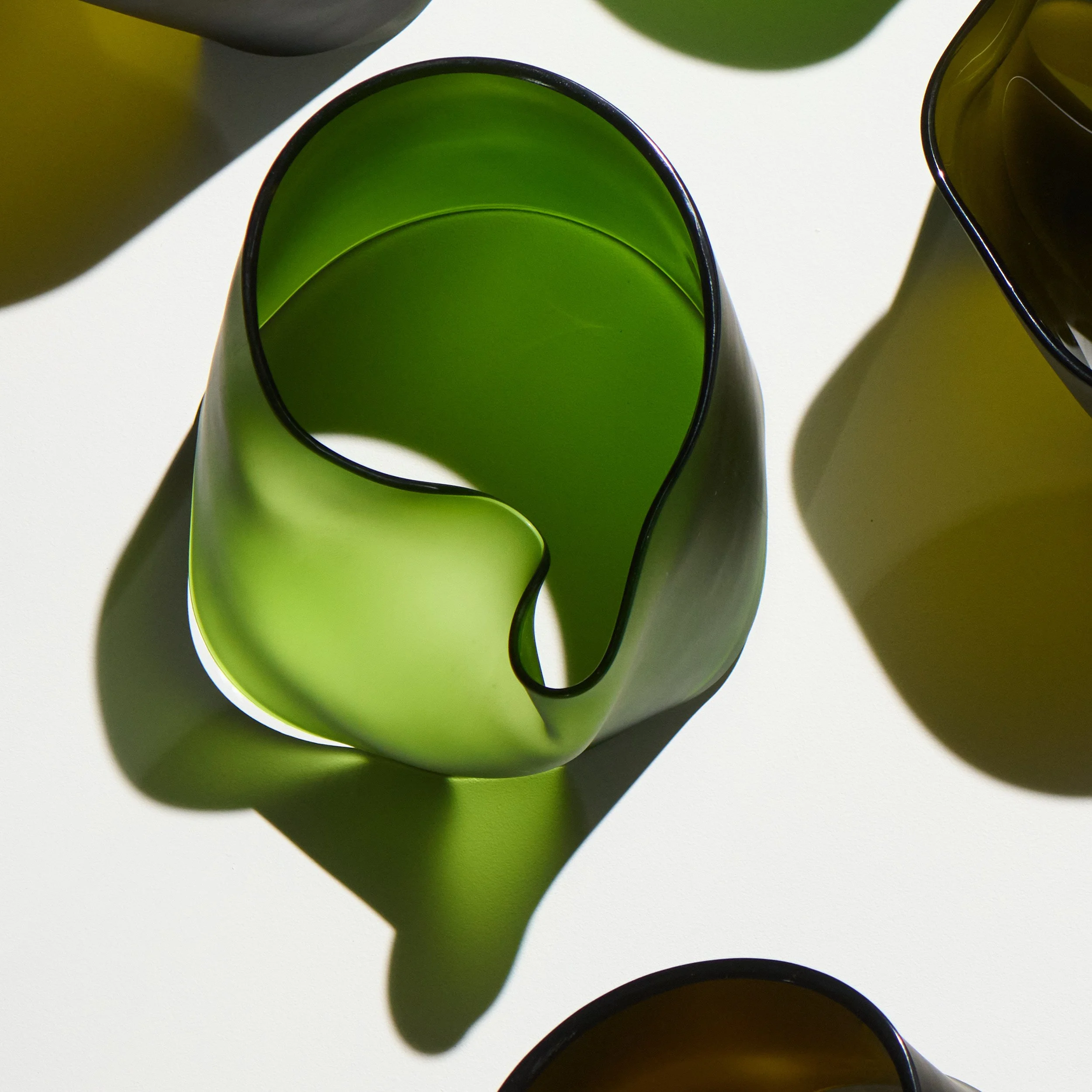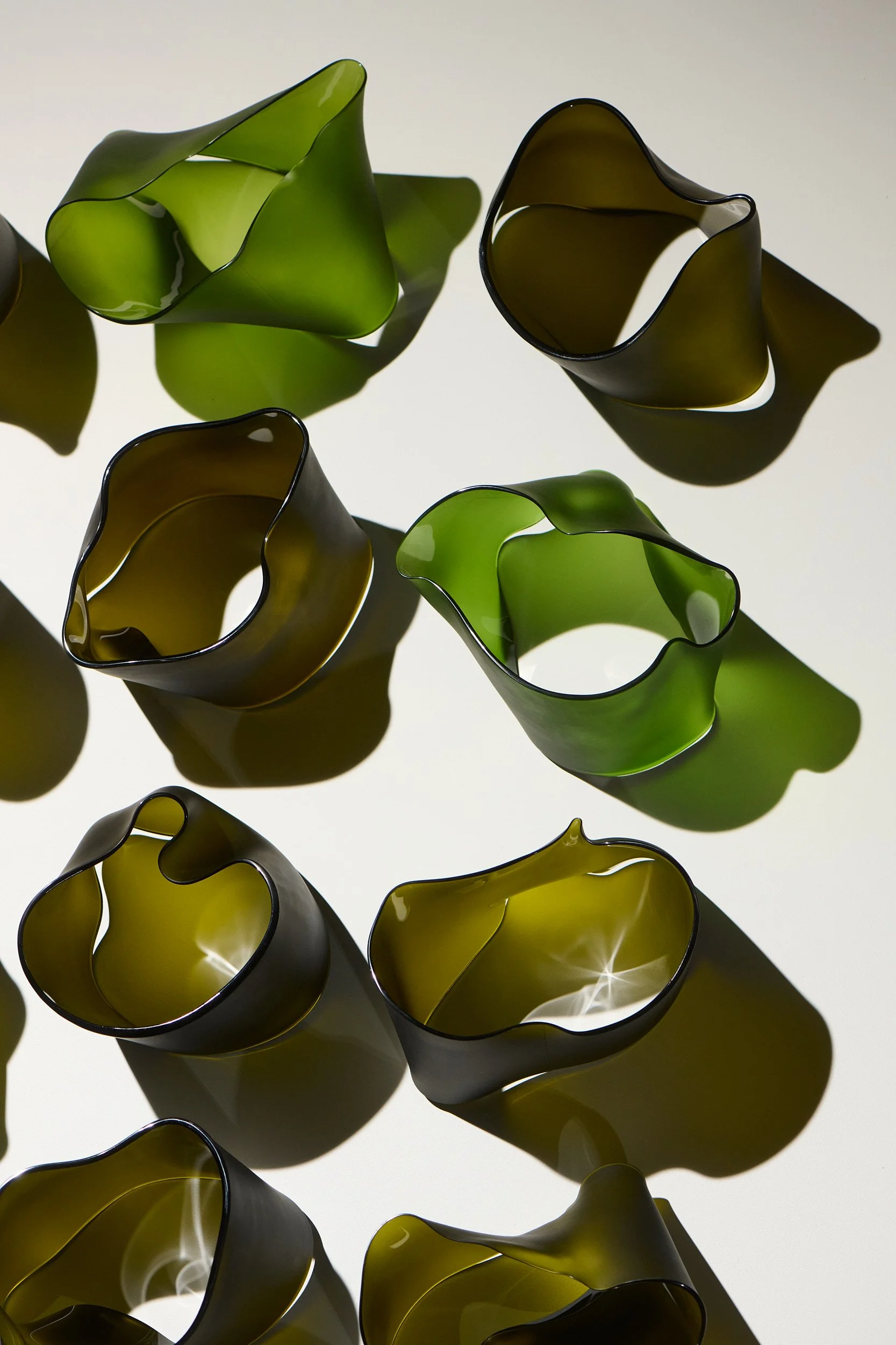 This inherent irregularity in the manufacturing process is one of the main elements Heatwave draws upon to create a diversity of forms, each of which is frozen in time amidst twisting, curling, and folding in the heat of the flame. Each patch of thin and thick deforms more and less, respectively, causing each unique ring of glass to collapse in its own distinct way.