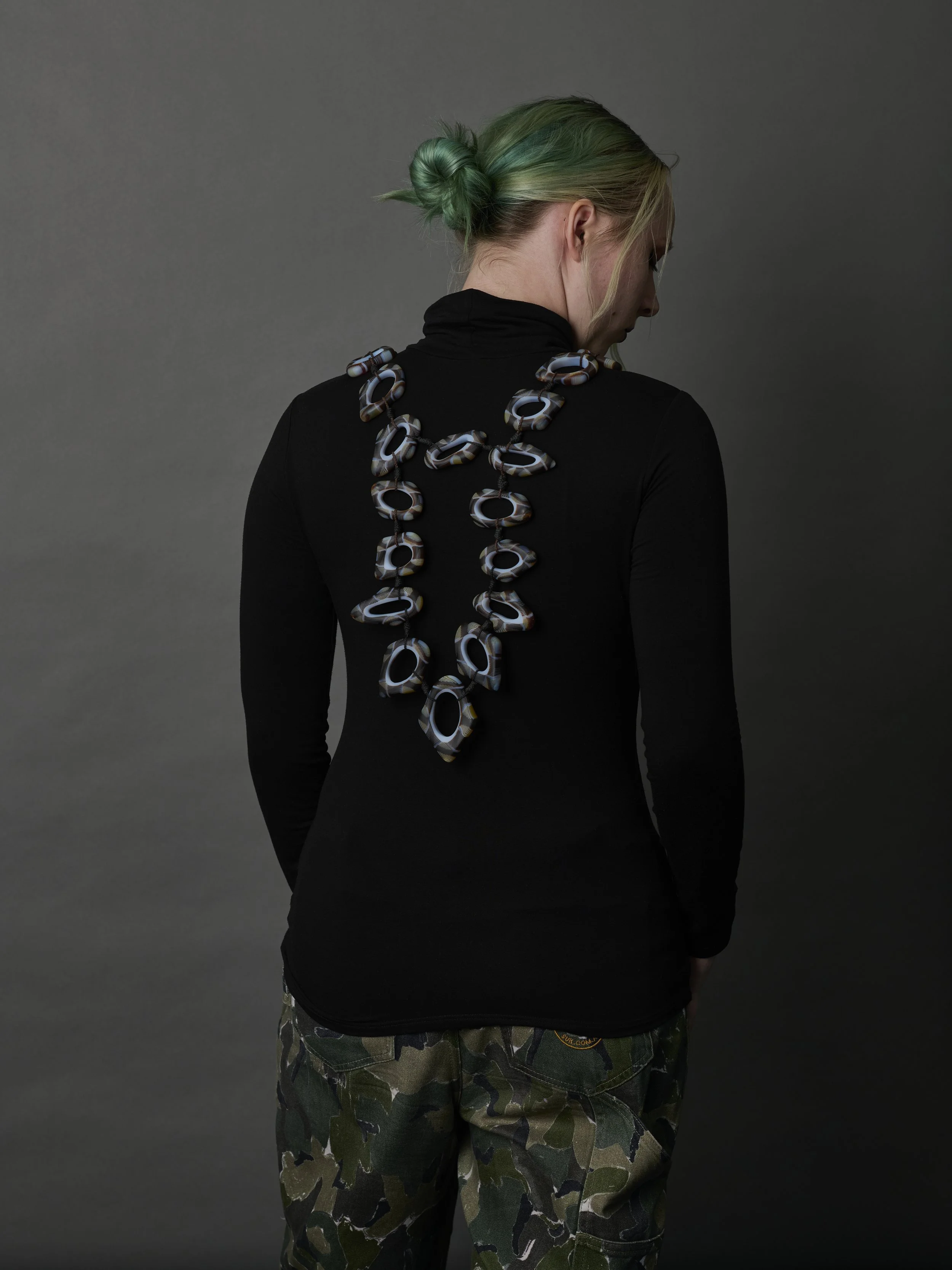 Throughout my jewellery practice I have returned to the amulet, an object worn close to the heart, traditionally a guardian against harmful spirits and an opening for benevolent ones. Given the chance to work with sheet glass, I was drawn to expand this intimate form into body adornment. Each hand-formed glass link becomes a bead, bound sequentially by plaited, knotted cord. The result is a supple, protective adornment that carries strength, rhythm, and movement.